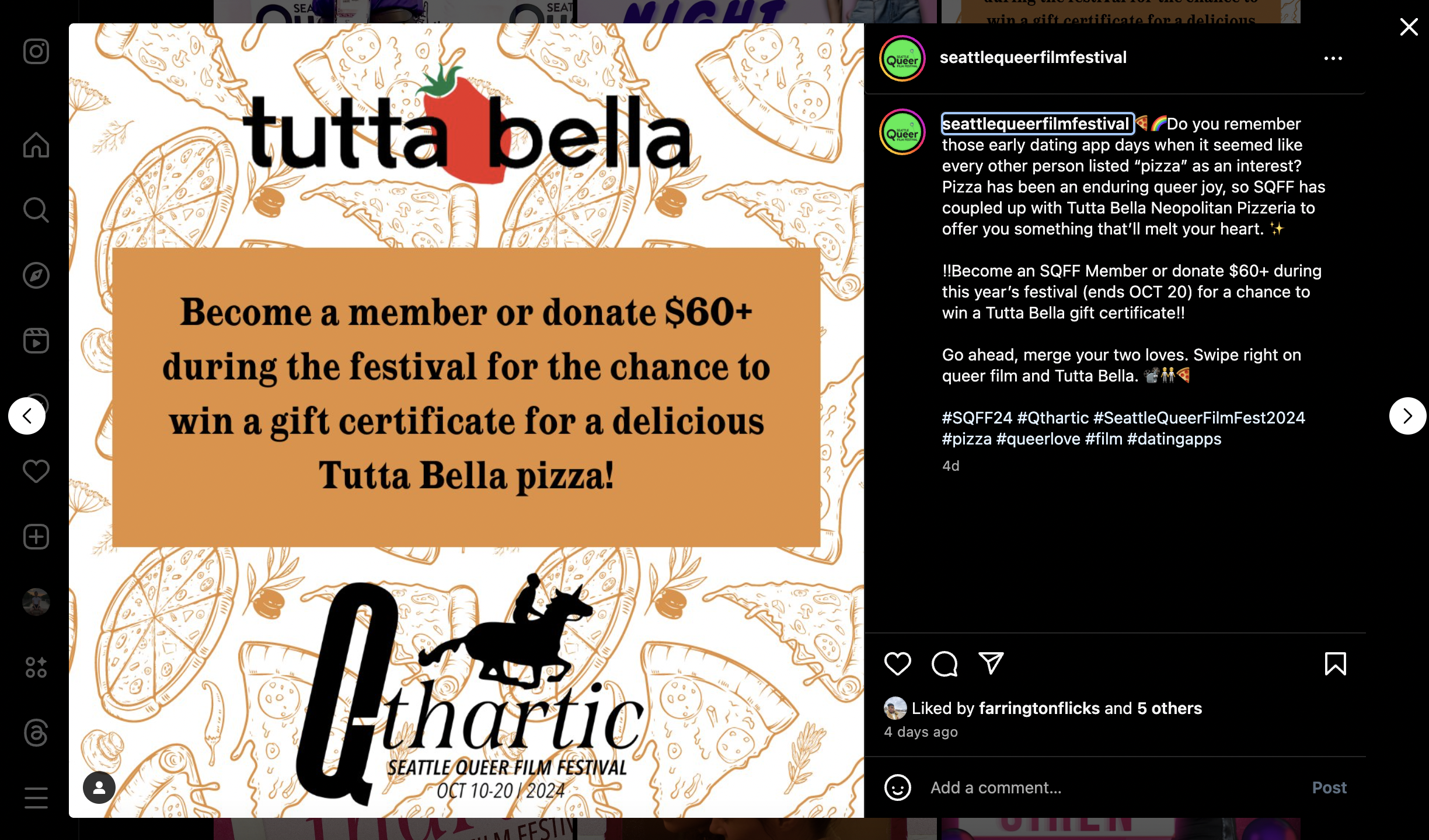 Go ahead, merge your two loves. Swipe right on queer film and Tutta Bella. 📽️🧑🤝🧑🍕